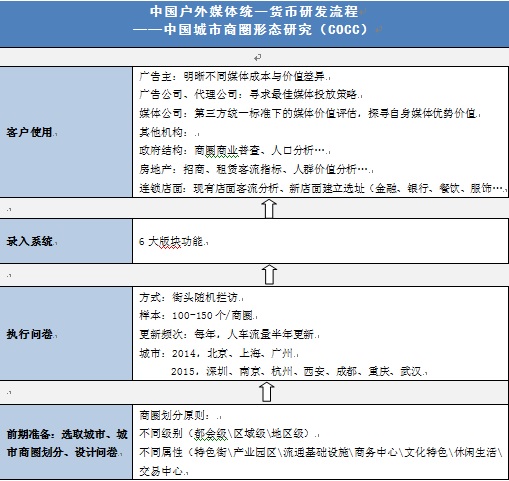 勵(lì)精圖治、歷久彌堅(jiān),CODC在2014年底正式研發(fā)出中國戶外媒體統(tǒng)一貨幣-中國城市商圈形態(tài)研究(China Outdoor Common Currency)