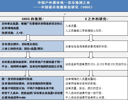 COCC是中國大陸第一個(gè)由第三方獨(dú)立開展,客觀、公正的戶外媒體統(tǒng)一衡量工具的研究。通過對(duì)中國大陸進(jìn)行的城市商圈人車流量、戶外媒體分布、商圈人群結(jié)構(gòu)形態(tài)研究,通過受眾的媒體滲透率以及千人成本指標(biāo),形成不同戶外媒體之間價(jià)值換算的統(tǒng)一貨幣。2014年開始的從北京、上海、廣州一線城市展開,之后陸續(xù)推廣到全國30個(gè)城市的連續(xù)性研究。