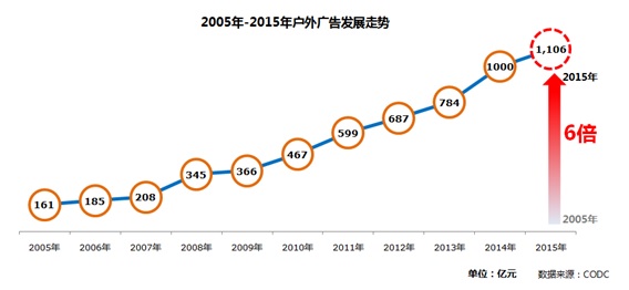 從2005年至2015年,戶外廣告走過了又一個(gè)風(fēng)雨十年,隨著經(jīng)濟(jì)、科技的飛速發(fā)展,現(xiàn)今廣告的投放理念與媒體形式都發(fā)生了巨大變化,投放量增長(zhǎng)已是十年前的六倍。