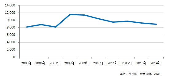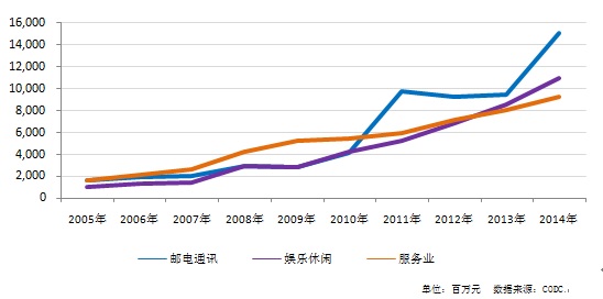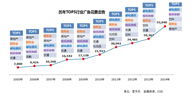 CODC數(shù)據(jù)顯示,2005年至2014年十年間,郵電通訊、娛樂休閑、服務(wù)業(yè)的廣告投放始終保持在行業(yè)投放的前五名內(nèi)。其中,郵電通訊行業(yè)廣告隨著互聯(lián)網(wǎng)行業(yè)的飛速發(fā)展而呈現(xiàn)逐年上升勢(shì)頭,從2011年開始,郵電通訊連年保持霸主地位。娛樂休閑行業(yè)廣告則隨著影業(yè)、旅游、真人秀綜藝節(jié)目的火熱發(fā)展而呈現(xiàn)強(qiáng)勢(shì)增長(zhǎng)勢(shì)頭。