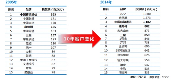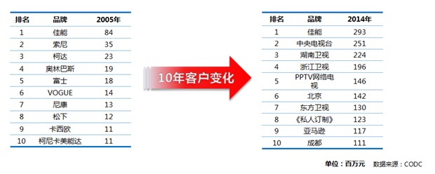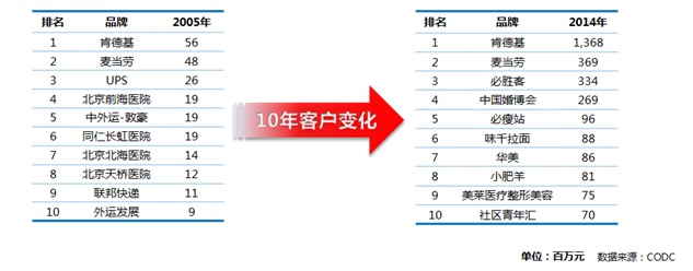 CODC數(shù)據(jù)顯示,戶外廣告客戶經(jīng)歷了十年的滄桑巨變,2014年仍保持在前十品牌排行榜的客戶有