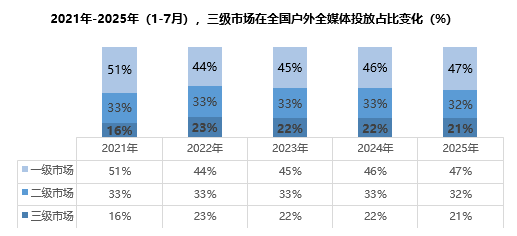 歷年來,三級市場在全國戶外全媒體投放中的占比保持平穩(wěn)發(fā)展態(tài)勢。2025年1-7月,三級市場投放占比達(dá)到21%,較2021年同期提升5個百分點(diǎn)。與此同時,一級和二級市場占比分別為47%和32%,較2021年同期分別下降4%和1%。盡管一二級市場仍占據(jù)主導(dǎo)地位,但三級市場在戶外全媒體中的重要性正持續(xù)增強(qiáng)。