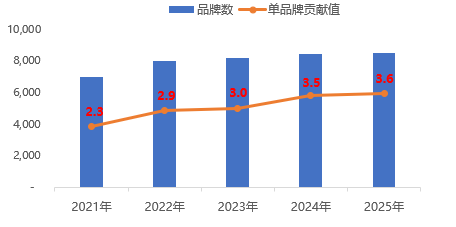 2021年-2025年(1-7月)三級市場投放品牌數(shù)量及單品牌貢獻(xiàn)值(單位:個、百萬元/個)