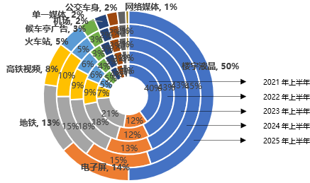 歷年來,樓宇液晶始終占據(jù)三級市場媒體投放的主導(dǎo)地位。2025年1-7月,其在整體投放中的占比已達(dá)50%,較2021年提升15個百分點(diǎn),領(lǐng)先優(yōu)勢持續(xù)擴(kuò)大。電子屏與地鐵媒體作為重要補(bǔ)充,占比分別為14%和13%。其中電子屏格局相對平穩(wěn),份額波動有限;而地鐵媒體由于三級市場擴(kuò)張緩慢,受主流渠道擠壓明顯,同期占比下降8%,面臨嚴(yán)峻的結(jié)構(gòu)性挑戰(zhàn)。