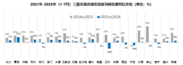 從地域表現(xiàn)來看,2025年1-7月,長沙拿下了三級市場投放城市的榜首,青島、濟(jì)南、鄭州緊隨其后,投放規(guī)模均突破20億元,形成明顯的區(qū)域頭部陣營。從變動趨勢看,除蘇州、哈爾濱、蘭州、貴陽、寧波、太原、南寧等少數(shù)城市投放有所收縮之外,絕大多數(shù)城市仍保持增長。但值得警惕的是,與去年同期相比,所有市場的增速均出現(xiàn)回落,顯示出三級市場整體雖仍在擴(kuò)張,但增長動力已普遍放緩。