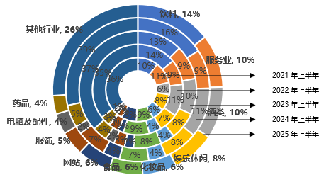 歷年來,三級市場的行業(yè)投放格局整體保持穩(wěn)定,主要投放品類始終圍繞日常消費(fèi)領(lǐng)域,飲料、服務(wù)業(yè)及酒類長期占據(jù)主導(dǎo)地位。2025年1-7月,TOP10行業(yè)投放集中度進(jìn)一步上升,合計占比74%,較2024年同期的71%提升3個百分點(diǎn)。其中,服務(wù)業(yè)、娛樂休閑、化妝品及網(wǎng)站等行業(yè)占比有所提高,其余行業(yè)則出現(xiàn)不同幅度下滑。這一變化反映出三級市場在維持傳統(tǒng)消費(fèi)基本盤的同時,正逐步向服務(wù)、休閑與美妝等體驗型消費(fèi)領(lǐng)域傾斜,行業(yè)投放結(jié)構(gòu)持續(xù)優(yōu)化。
