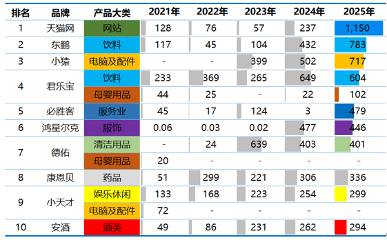 從TOP10品牌投放格局來看,三級市場頭部品牌的競爭態(tài)勢近年來發(fā)生顯著變化。2025年1-7月,天貓網(wǎng)以11.50億元的投放花費(fèi)位居榜首。除“鴻星爾克”、“德佑”同比有所下降之外,其余品牌較2024年同期均大幅增長,顯示出頭部品牌在三級市場持續(xù)加碼。