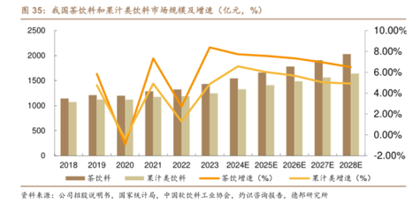 隨著健康理念、低糖低油以及去碳酸的飲食文化的興起,推動(dòng)中國(guó)茶飲料行業(yè)迅速發(fā)展。2023年中國(guó)茶飲料市場(chǎng)規(guī)模為1434億元,在即飲軟飲市場(chǎng)中僅次于包裝飲用水位列第二,預(yù)計(jì)2028年市場(chǎng)規(guī)模將突破2000億元。