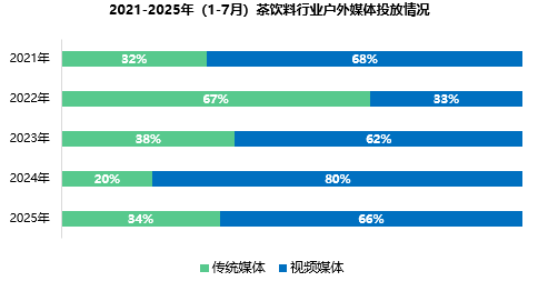近五年,茶飲料行業(yè)戶外媒體投放呈現(xiàn)出巨大波動(dòng)。2021年傳統(tǒng)媒體占比32%,視頻媒體68%;2022年傳統(tǒng)媒體逆勢(shì)增長(zhǎng)至67%,視頻媒體相應(yīng)收縮;下一年視頻媒體再次強(qiáng)勢(shì)反超。盡管期間出現(xiàn)明顯起伏,但到2025年,傳統(tǒng)媒體與視頻媒體的占比回歸與2021年相似的狀態(tài),再次形成三七開(kāi)的局面。這種波動(dòng)反映出行業(yè)在探索期經(jīng)歷了策略調(diào)整,最終確立了相對(duì)穩(wěn)定的媒體配比。