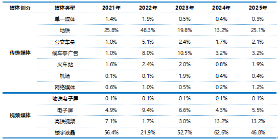 視頻媒體中,樓宇液晶媒體始終占據(jù)主導(dǎo)地位,2025年占比46.8%雖較2021年56.4%有所下降,但仍占據(jù)近半壁江山。高鐵視頻媒體成為最大亮點(diǎn),從2021年7.1%快速增長(zhǎng)至2025年13.2%,增幅較大,證明其交通視頻媒體價(jià)值獲得市場(chǎng)認(rèn)可。