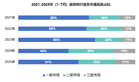 茶飲料行業(yè)戶外投放呈現(xiàn)明顯的市場(chǎng)層級(jí)戰(zhàn)略調(diào)整。二、三級(jí)市場(chǎng)穩(wěn)步增長(zhǎng),一級(jí)市場(chǎng)雖保持主導(dǎo)地位,但占比從2021年60%下降至2025年51%,五年間減少9個(gè)百分點(diǎn),特別是在2024年,一級(jí)市場(chǎng)占比驟降至43%,創(chuàng)歷史新低,二、三級(jí)市場(chǎng)合計(jì)占比首次超過(guò)一級(jí)市場(chǎng),反映出品牌策略的重大調(diào)整。這一變化軌跡顯示品牌開(kāi)始適度分散投放重心,在保持一線城市核心投放的同時(shí),更加注重新興市場(chǎng)的開(kāi)發(fā)潛力。體現(xiàn)出茶飲料行業(yè)正在通過(guò)更加精細(xì)化的區(qū)域策略,實(shí)現(xiàn)全國(guó)市場(chǎng)的協(xié)同發(fā)展。