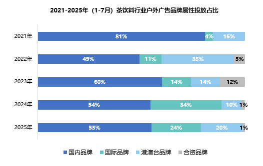 茶飲料品牌在戶外廣告領(lǐng)域呈現(xiàn)出多元化的競(jìng)爭(zhēng)格局。國(guó)際品牌實(shí)現(xiàn)突破性增長(zhǎng),受“三得利”、“可口可樂(lè)”、“雀巢”等巨頭加大投放的推動(dòng)下,市場(chǎng)份額從2021年4%攀升至2024年34%的峰值,2025年仍維持在24%的較高水平,成為市場(chǎng)格局變化的主要推動(dòng)力。以“統(tǒng)一”、“康師傅”為代表的港澳臺(tái)品牌份額則呈現(xiàn)波動(dòng)特征,從2021年15%猛增至2022年的34%,最終穩(wěn)定在20%。而"農(nóng)夫山泉"、"加多寶"、"王老吉"等國(guó)內(nèi)品牌雖然持續(xù)保持市場(chǎng)主導(dǎo)地位,但份額從2021年81%降至2025年55%,領(lǐng)先優(yōu)勢(shì)明顯收窄。