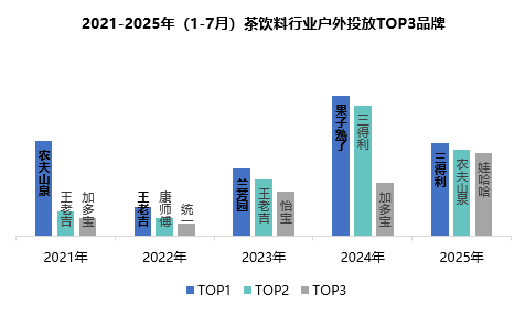 值得注意的是,農(nóng)夫山泉和王老吉作為傳統(tǒng)強(qiáng)者,雖然排名有所波動(dòng),但仍保持在戶外投放前列,顯示出其持續(xù)的品牌投入和深厚的市場(chǎng)根基。而娃哈哈2025年首次進(jìn)入前三,也預(yù)示著老牌飲料企業(yè)正在重新加碼茶飲料市場(chǎng)。