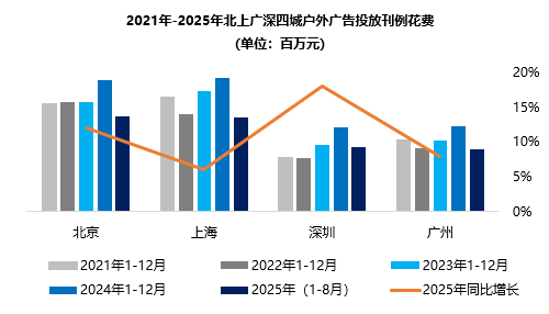 根據(jù)中天盈信(CODC)數(shù)據(jù)庫顯示,2025年1-8月,北京市的戶外廣告投放刊例花費接近240億元人民幣,在四城中占據(jù)首位,其后依次為上海、深圳和廣州。從各城市的同比增長來看,四城都表現(xiàn)良好,同比增幅均超過5%,其中深圳較上年同期增長18%,增幅為各城市最高。