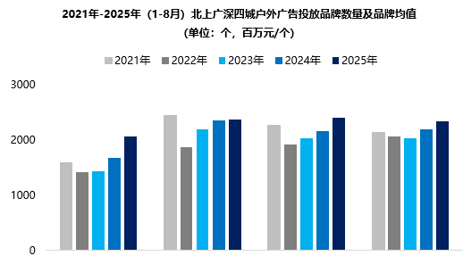 從投放的品牌數(shù)量上來看,近幾年1-8月,北京、上海、深圳三座城市的變化趨勢較為相似,具體表現(xiàn)為:在2021 年達到階段性峰值后,2022年出現(xiàn)顯著回落,后續(xù)年份則逐步進入復蘇階段,截至2025年1-8月,北京與深圳的投放品牌數(shù)量已超越2021年的峰值水平。?上海的復蘇速率相對落后于北京與深圳,但也已經接近 2021年的峰值水平。相較之下,廣州的復蘇進程更為滯后,品牌投放數(shù)量的下滑態(tài)勢持續(xù)至 2023 年,直至 2024年才顯現(xiàn)好轉跡象,但值得關注的是,廣州后續(xù)恢復速度顯著高于其他城市,2025年1-8月期間,其投放品牌數(shù)量已攀升至近五年同期的最高水平。?