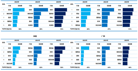2023年-2025年(1-8月)北上廣深四城戶外廣告投放TOP5行業(yè)對比