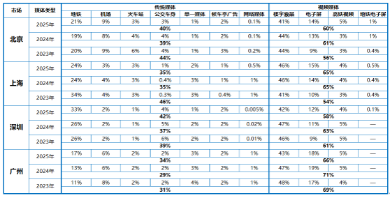 從四城的投放媒體分布情況來看,近三年視頻媒體的受青睞程度顯著高于其他類型,四座城市視頻媒體的投放占比均維持在60%左右。在視頻媒體細分領域中,樓宇液晶媒體占據(jù)絕對主導地位,其投放占比始終保持在 40% 以上。?