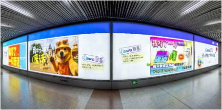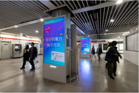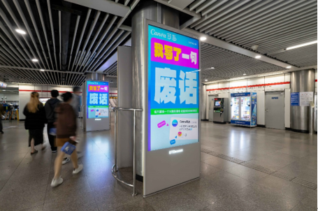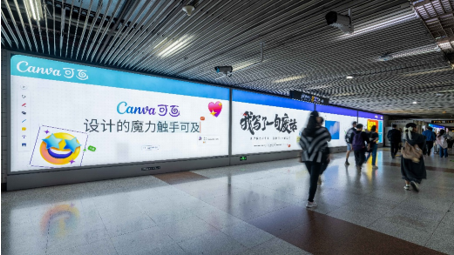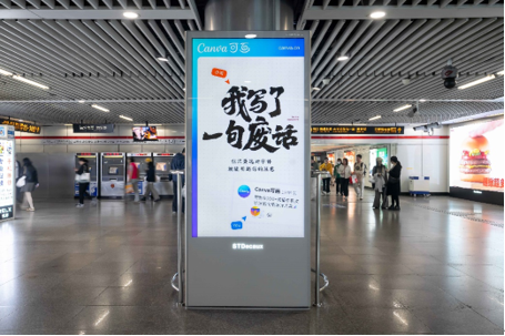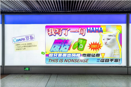 11 月 1 日,上海中山公園地鐵站內,Canva 可畫在大屏上呈現(xiàn)了一組風格多元的創(chuàng)意廣告。從小貓 meme、千禧配色到豪放潑墨文字,畫面元素豐富鮮明,而其中最引人駐足的,是一句直白又戲謔的文案——「我寫了一句廢話」。