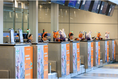 圍繞「瘋狂動物城」這一熱門 IP,東航打造了貫穿「航站樓—客艙—空中旅途」的全流程沉浸式體驗。浦東機場 T1 航站樓的 B 島值機區(qū)、自助設(shè)備、愛心服務(wù)區(qū)、登機口等多處場景均以「瘋狂動物城」元素裝點,吸引不少旅客爭相打卡。