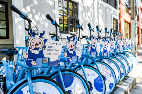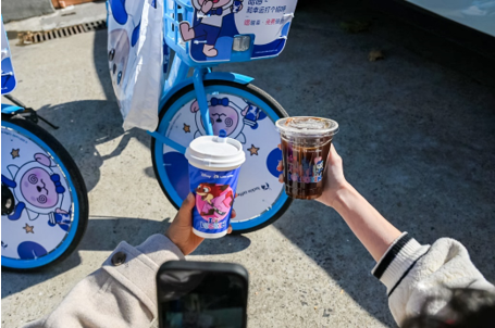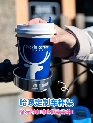 此次聯(lián)名單車,哈啰在車輪部分繪制上了瑞幸吉祥物lucky的形象,秒變街頭顯眼包;同時關(guān)注到大家在騎行時不便攜帶咖啡的痛點,品牌在車把手上特別定制車杯架,即使騎行時咖啡也能穩(wěn)穩(wěn)當(dāng)當(dāng)不灑一滴。