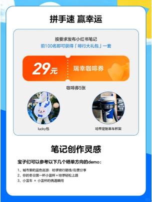 即日起,這些定制單車被投放至上海與廣州兩城,用戶打開哈啰 app 掃碼騎行并下單瑞幸,還有機(jī)會免費騎哈啰單車。與此同時,哈啰在小紅書開啟筆記征集活動,用戶分享自己的「幸運啡行瞬間」,即有機(jī)會獲得「瑞幸咖啡券+lucky包+定制車杯架」的驚喜好禮。