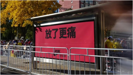 耐克在北京街頭投放了一組文案,刻畫(huà)了跑者的訓(xùn)練日常,“奧森刷了千百圈”、“天沒(méi)亮就開(kāi)練”、“跟每一秒較勁”、“戰(zhàn)三伏,頂暴雨”等,高度還原了跑者枯燥、痛苦卻又充滿執(zhí)念的日常訓(xùn)練,說(shuō)出了他們的心聲。