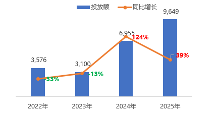 2022年-2025年(1-11月)護(hù)膚用品投放刊例花費(fèi)及同比增速(單位:百萬元)