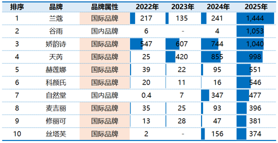 2022年-2025年(1-11月)護(hù)膚用品TOP10品牌戶外投放刊例花費(fèi)(單位:百萬元)