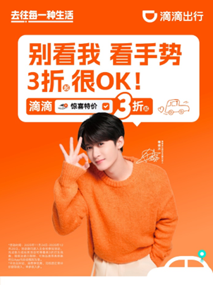 不同傳統(tǒng)的藝人形象照,滴滴選擇讓代言人直接在廣告上就和用戶對話玩起來,以互動文案與用戶溝通。品牌巧妙地抓住了「OK」這一全球通用的手勢,將其三指豎起的形態(tài)與「3 折」這一核心利益點進行視覺綁定,以降低用戶的記憶成本。在地鐵站等人流集中地,品牌發(fā)布「別看我,看手勢,3 折,OK」、「天氣 OK 不 OK 我不管,3 折必須 OK」等文案海報,形成強記憶點,實現(xiàn)了從品牌情感建設到具體品類心智占領的閉環(huán)。