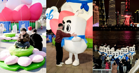 跨年夜當(dāng)晚,7 只小奶人 IP 人偶集體亮相,獻(xiàn)上定制版屁音《新年快樂》表演與舞蹈,用「噗噗噗」的魔性節(jié)奏點(diǎn)燃全場氛圍?;顒?dòng)期間,這群可愛的「街溜子」還在上海開啟「炸街」模式,復(fù)刻領(lǐng)帶轉(zhuǎn)場挑戰(zhàn)、集體跳海豹舞、「敢問閣下怎么稱呼」等社交熱梗,推出一系列視頻,并聯(lián)動(dòng)小紅書博主@宇宙男孩正峰進(jìn)行互動(dòng),進(jìn)一步放大活動(dòng)聲量。