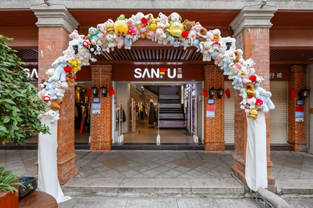 不僅如此,為了貼合泉州在地的“簪花氛圍”,我們也給三福門店整了個新“花”型——用玩偶公仔做了個簪娃拱門,每一個來到門店的人都能體驗到福氣的“天花板”。