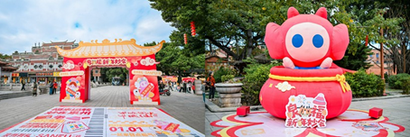 極具廟會特色的大拱門,換上了新年皮膚的小福龍來歡喜坐鎮(zhèn)。