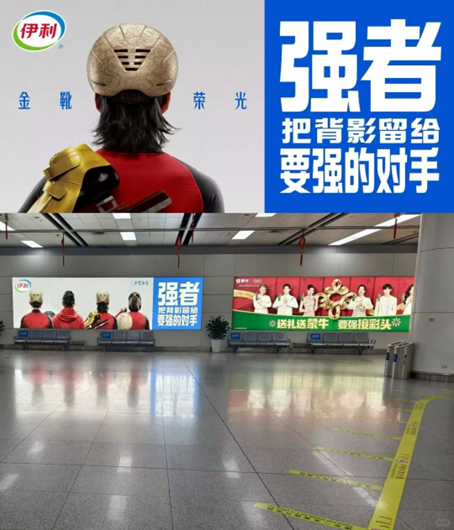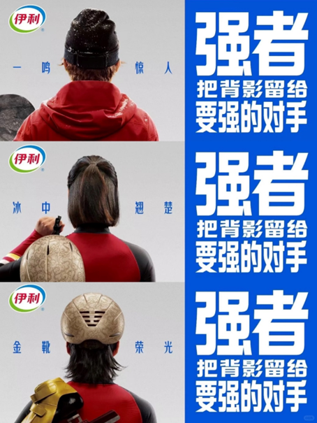 近日,就有不少網(wǎng)友在呼和浩特機(jī)場(chǎng)內(nèi),發(fā)現(xiàn)了一幅和傳統(tǒng)印象中完全不一樣的伊利海報(bào)。海報(bào)并未露出出鏡人員的正臉,而是以背影和她們的裝備來(lái)暗示自己的身份,配以「強(qiáng)者,把背影留給要強(qiáng)」的對(duì)手文案,與旁邊蒙牛六位代言人正臉出鏡的海報(bào)形成了鮮明對(duì)比。有趣的是,「營(yíng)養(yǎng)世界每個(gè)人的要強(qiáng)」是蒙牛的廣告語(yǔ),「要強(qiáng)」也是其品牌主張,而伊利的文案巧妙的呼應(yīng)了賽場(chǎng)上強(qiáng)者遙遙領(lǐng)先留給對(duì)手背影的事實(shí),還為即將官宣的四位奧運(yùn)健將代言人蒙上了一層神秘的面紗。