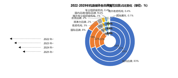 歷年來,機(jī)場(chǎng)媒體投放均以國內(nèi)品牌投放為主,并逐年呈現(xiàn)出本土品牌強(qiáng)勢(shì)崛起、主導(dǎo)地位加固的發(fā)展態(tài)勢(shì)。2025年,國內(nèi)品牌在機(jī)場(chǎng)媒體投放占比83%,刨除機(jī)場(chǎng)視頻媒體之外,國內(nèi)品牌投放占比74%,與2024年同期相比提升5個(gè)百分點(diǎn)。與此同時(shí),受國內(nèi)品牌發(fā)展擠壓,國際品牌投放份額則由2024年同期的19%壓縮至8%。其余品牌屬性占比較小,份額發(fā)展相對(duì)穩(wěn)定。國內(nèi)品牌主導(dǎo)地位持續(xù)鞏固,國際品牌份額大幅收縮,行業(yè)話語權(quán)向本土品牌傾斜的趨勢(shì)愈發(fā)顯著。