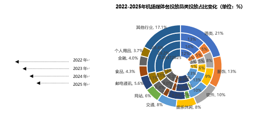 歷年來,機(jī)場(chǎng)媒體各行業(yè)投放格局相對(duì)穩(wěn)定。2025年,酒類、服飾、軟件、娛樂休閑及交通行業(yè)穩(wěn)居機(jī)場(chǎng)媒體投放TOP5,五大行業(yè)合計(jì)占比達(dá)到59%,較2024年同期大幅擴(kuò)張15個(gè)百分點(diǎn),廣告主預(yù)算進(jìn)一步向優(yōu)勢(shì)行業(yè)集中,行業(yè)投放集中度持續(xù)走高。各主投品類中,酒類、服飾、軟件、網(wǎng)站、食品行業(yè)在機(jī)場(chǎng)媒體投放份額有所增長,尤其是酒類與服飾重視高端場(chǎng)景投放優(yōu)勢(shì),兩行業(yè)投放份額分別提升8%及7%,成為拉動(dòng)機(jī)場(chǎng)媒體投放增長的主要力量。娛樂休閑、交通、郵電通訊、金融及個(gè)人用品行業(yè)則有不同程度下跌,反映出這幾類行業(yè)在機(jī)場(chǎng)高端場(chǎng)景的投放力度有所減弱,廣告預(yù)算或向其他渠道轉(zhuǎn)移。