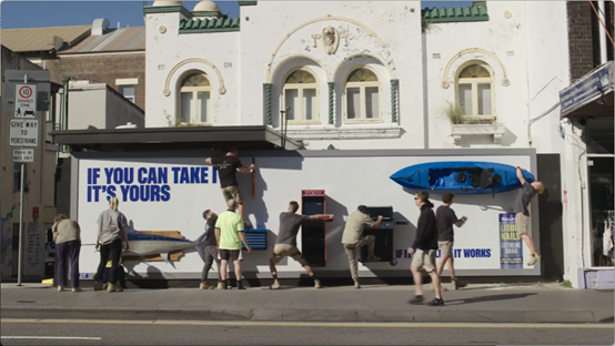 這是由澳大利亞犀利牌免釘膠Selleys Liquid Nails,在烈日街頭發(fā)起的一場挑戰(zhàn)賽——“If You Can Take It, It's Yours.如果你能承受,那就是你的了”。它用自己的產(chǎn)品,將一些好物黏上墻,比如游戲機(jī),皮劃艇等,只要路過的人們能掰得下來,那品牌就免費把好物送給他們。