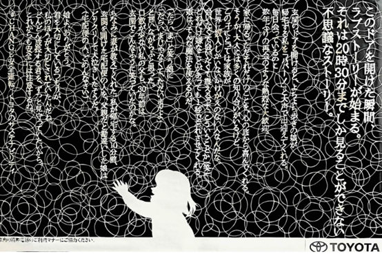 在江之島電鐵等地鐵場景中,豐田將這件孤品原樣呈現(xiàn)在乘客眼前。在嘈雜的通勤途中,這種細(xì)膩、沉靜且不可復(fù)制的藝術(shù)感,讓“觀看廣告”本身,變成了一次關(guān)于安全駕駛的深度沉思。